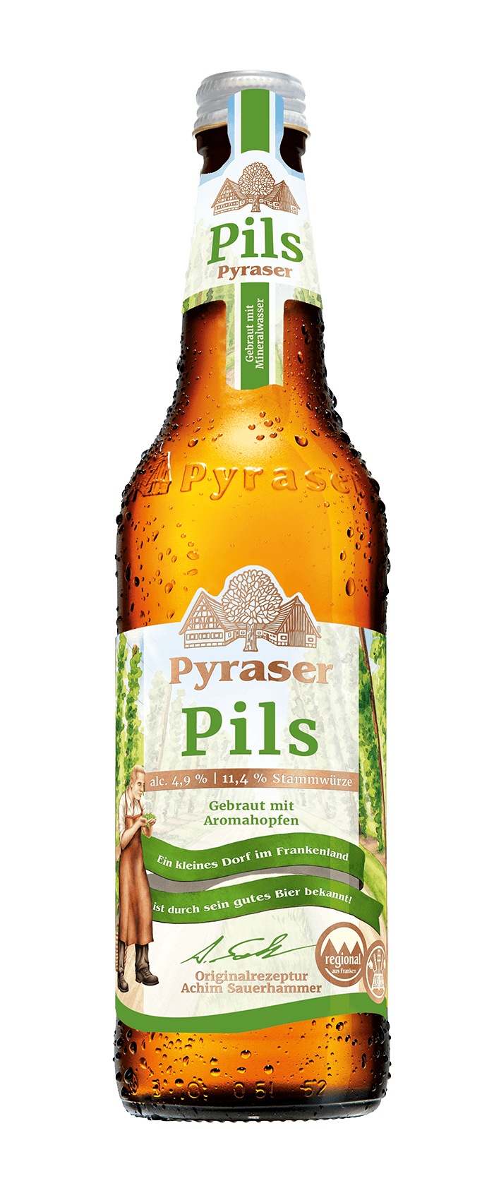 Durch die Verwendung von Saphir Aromahopfen, der eigens für die Pyraser Landbrauerei angebaut wird, bekommt das Pils ein unverkennbares Aroma. Es schmeckt keineswegs bitter, sondern ist einmalig hopfenaromatisch und blumig. Ein fränkisches Pils, das mit jedem Schluck verzaubert und Durst auf mehr macht.
